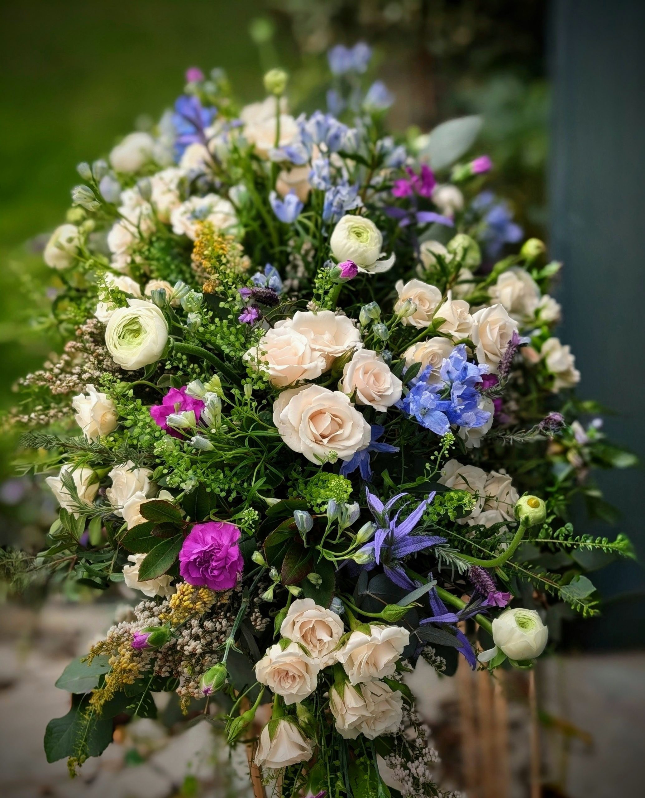 This tribute measures approximately 4ft (120cm) long and is made using a combination of roses and seasonal flowers in pinks and whites.