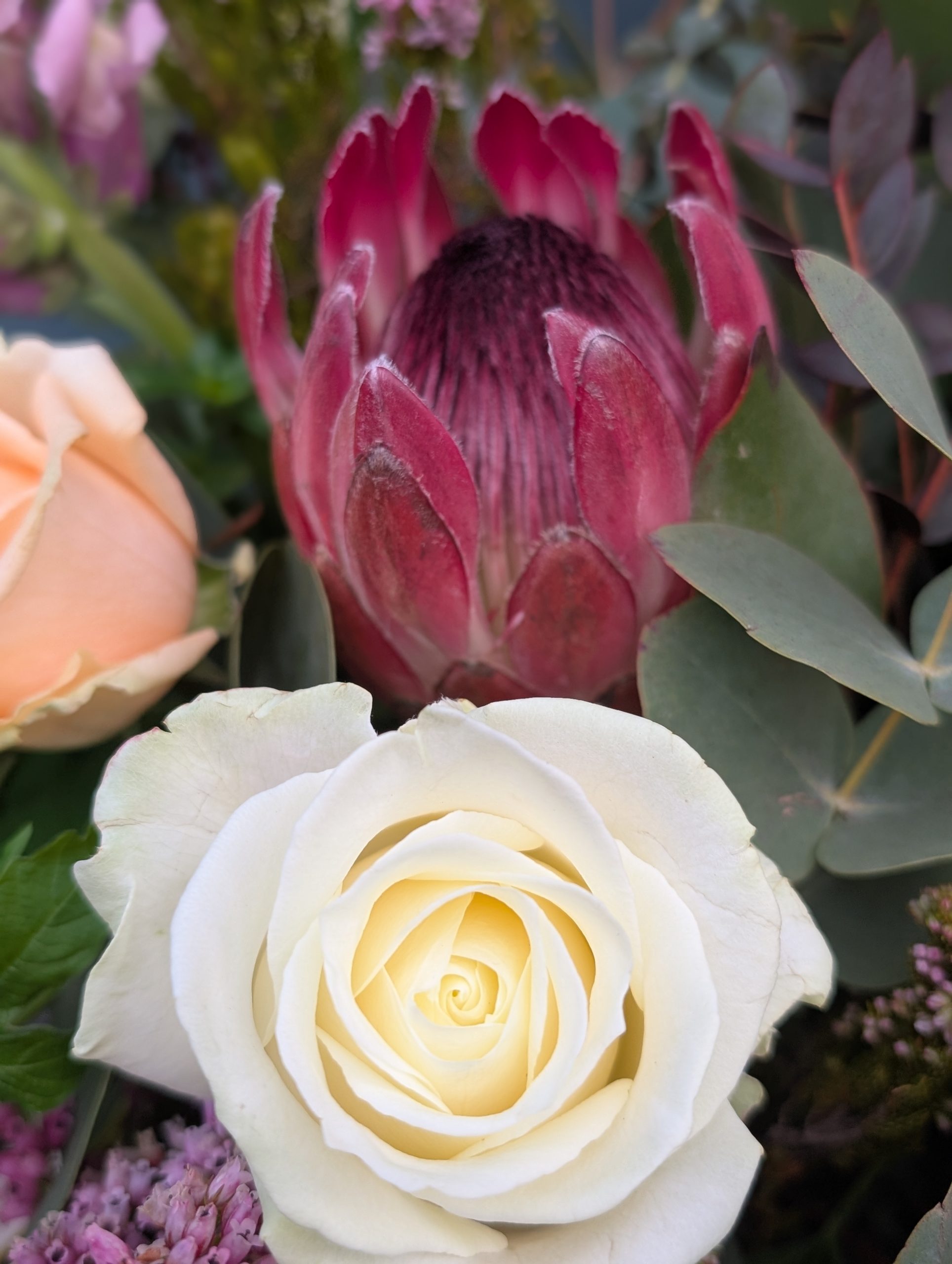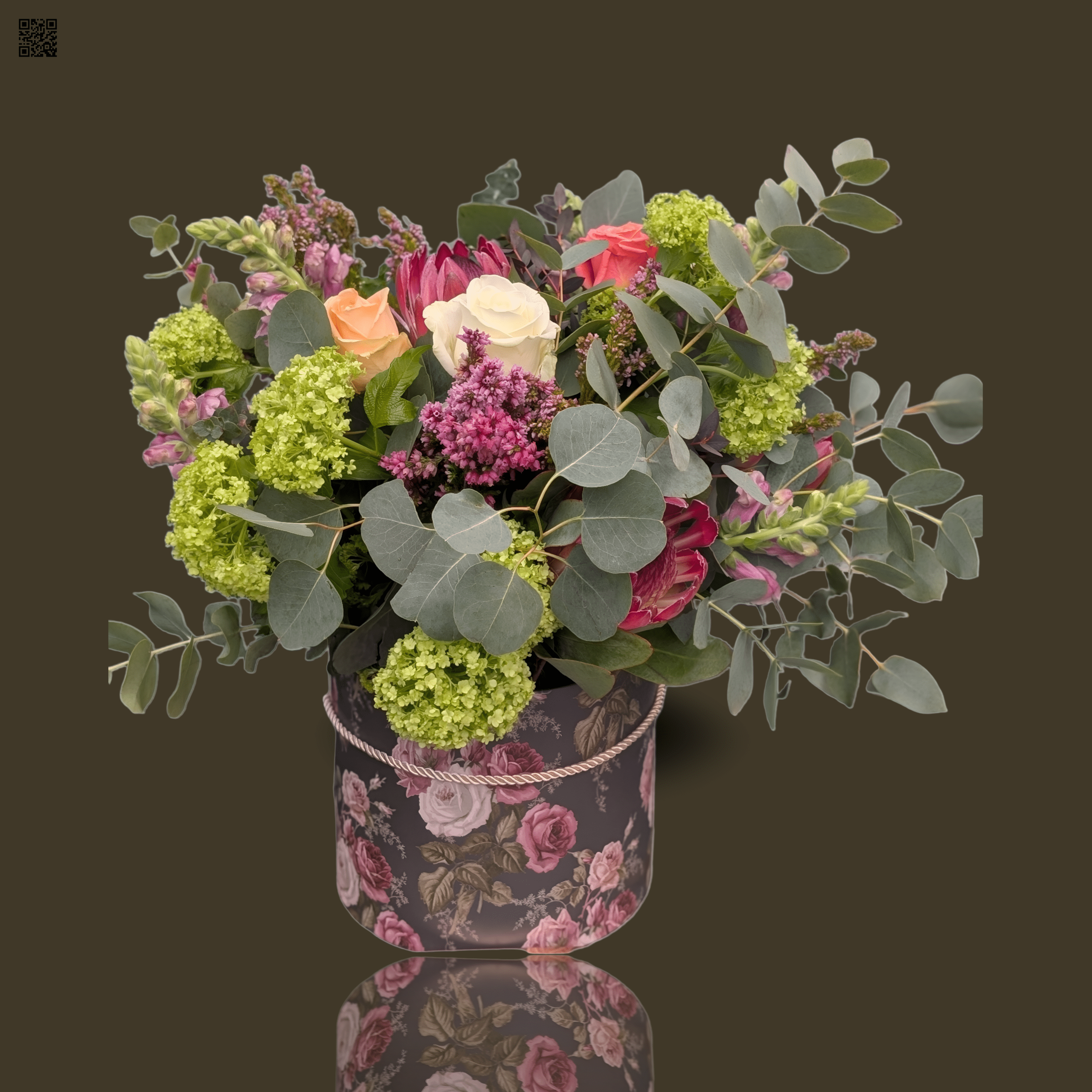 A luxurious mix of classic roses, soft viburnum and exotic protea make this a very sophisticated bouquet for a very sophisticated Mum.