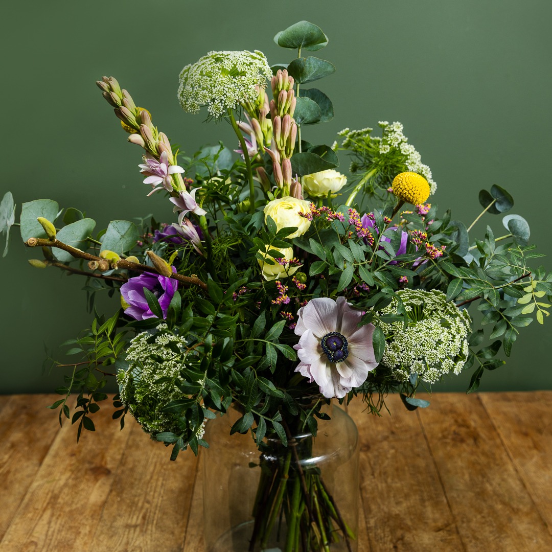 This hand-tied Mother’s Day bouquet includes some of the season’s most popular blooms such as of anemones and ranunculus in soft pastel colours.