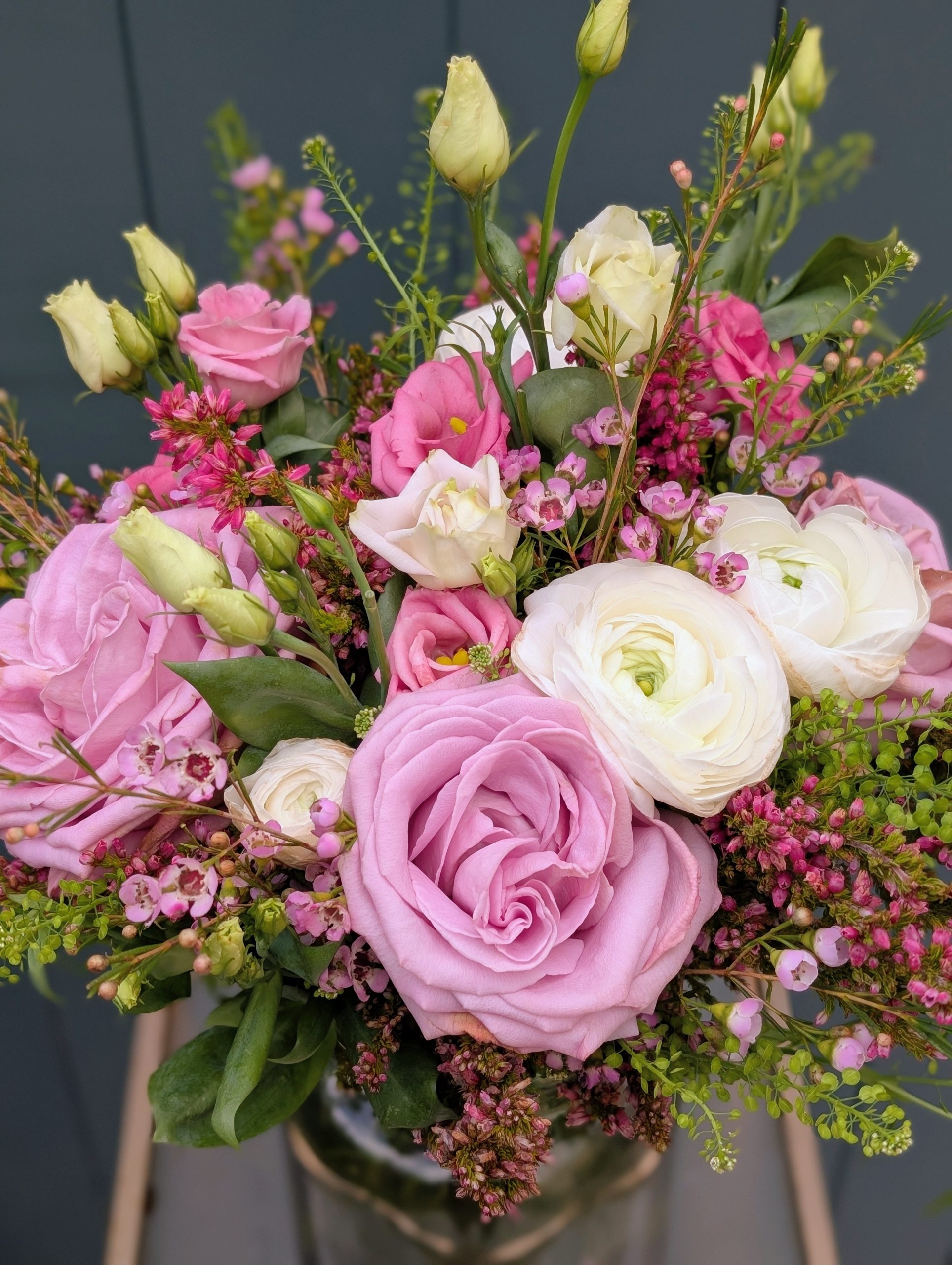 A hand-tied bouquet of pretty pink and white flowers including ranunculus, lisianthus and roses  -these flowers are guaranteed to be a huge hit with Mums.
