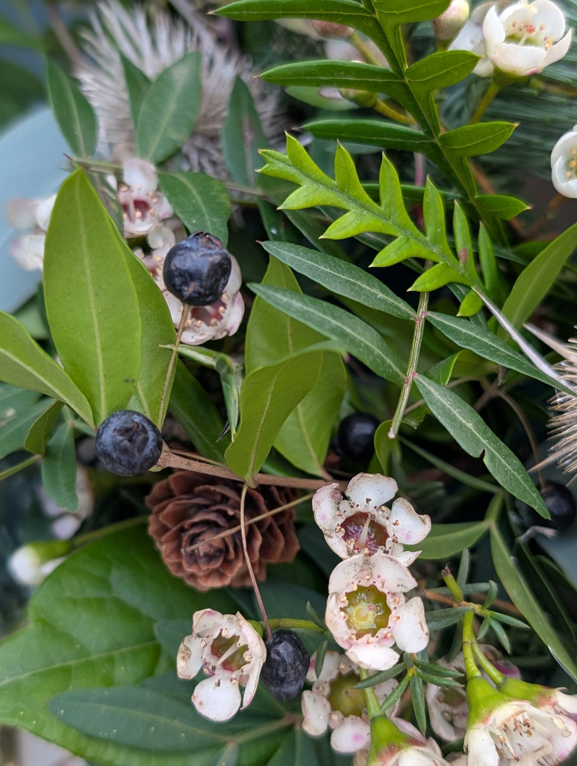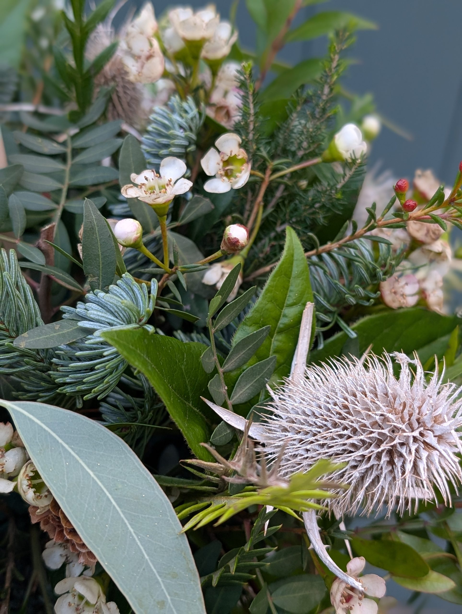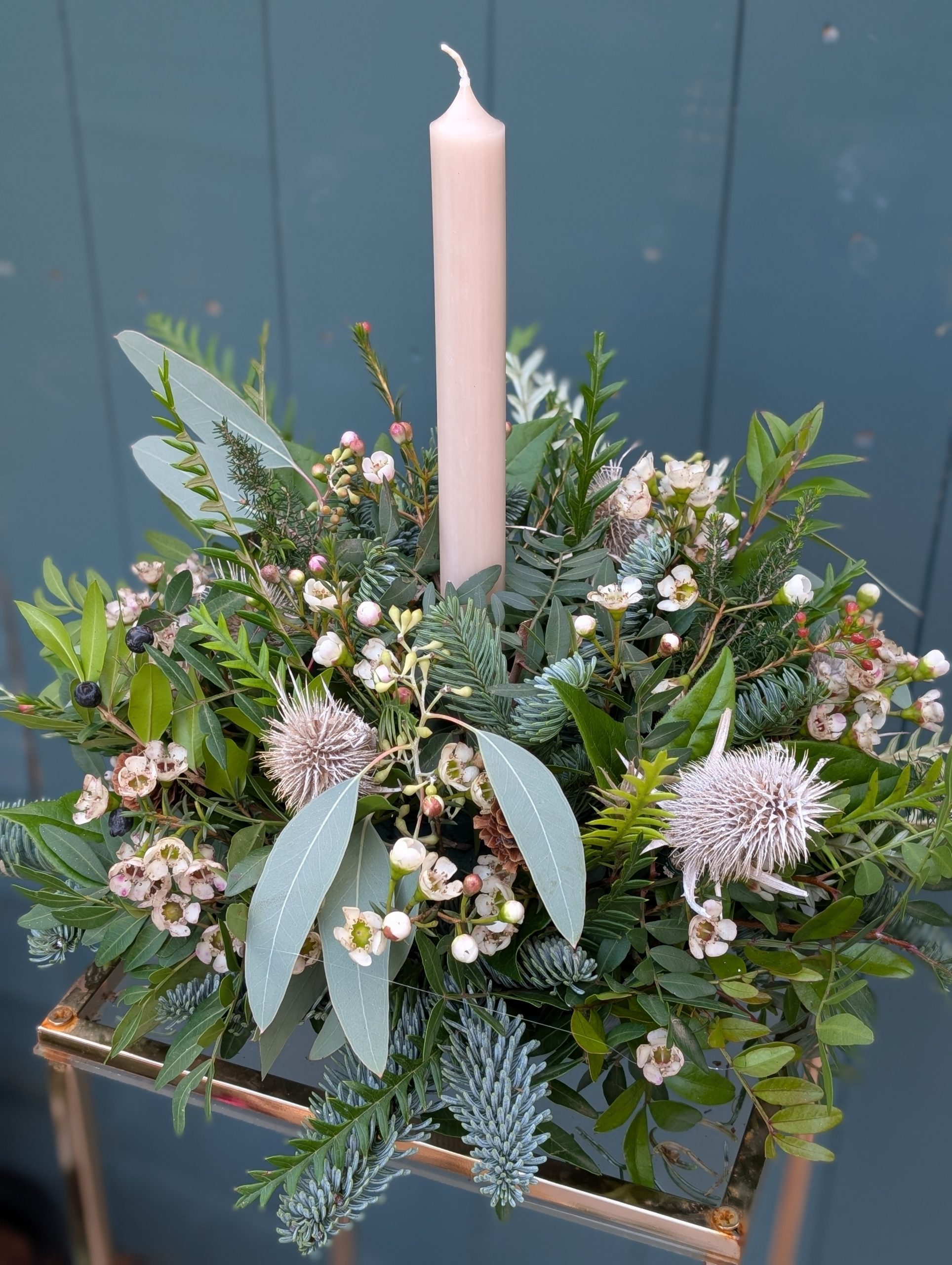 Dress your Christmas dining table with this elegant table centrepiece made with a mixture of green seasonal foliages and winter-white wax flower.
